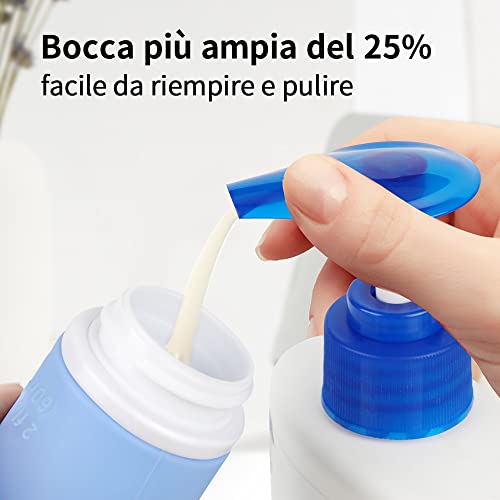 【Grande capacità】 Ogni bottiglia in silicone ha una capacità di 60 ml, adatta per lunghi viaggi. Il design dell'apertura è ampio, comodo da pulire all'interno con una spazzola e riempire un liquido denso.