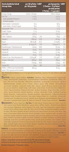 Powercocktail:estratti di bacche, frutta, verdure, erbe e spezie.Contiene fibre solubili e insolubili di frutta, verdura e cereali e batteri lattici vivi (L. reuteri, L. acidophilus) Combinazione unica di micronutrienti bioattivi, come vitamine⁴ e oligoelementi. -,vitamina B2 (Ribo Avin) B3 (Niacina),vitamina B6 (piridossina), vitamina B12 (cobalamina) e vitamina C