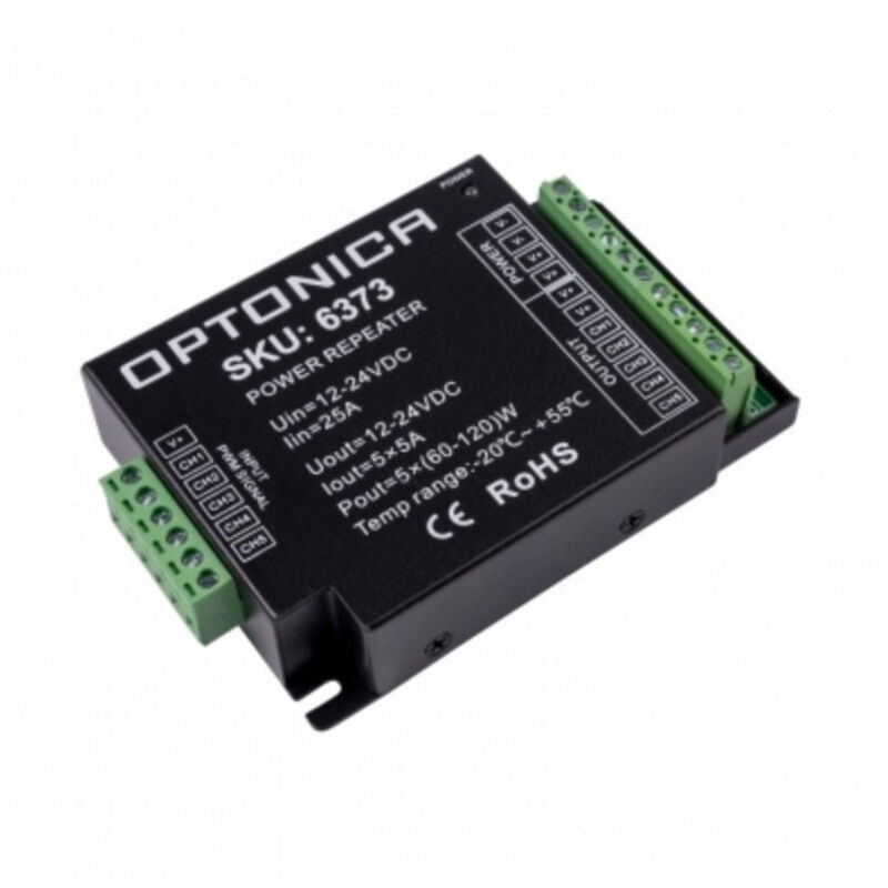 Funziona solo da DC 12V a 24V. Amplificatore con connessione di 5 gambi: 5A/ch max. Consente di aumentare il controllo remoto delle tue lampadine a LED o nastri. Uso interno. Dimensioni: 80 x 120 x 303 anni di garanzia. Colore: Nero Potenza massima (W): 300-600 W Certificazione: CE e ROHS Garanzia: 2 anni Intervallo di temperatura ambiente (°C): -20°C/+40°C Corrente massima: 25A Disponibilità: Spedizione entro 6 giorni Etichetta: SÌ Digitare Posizione: MEDIA