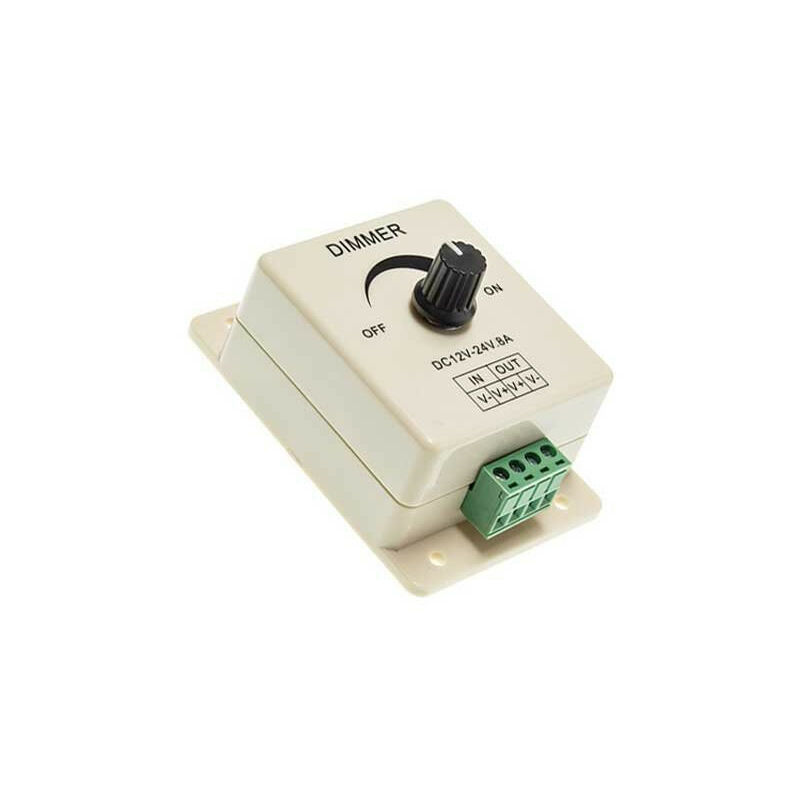 Variabile LED 96-192W. Con questo controller, è possibile guidare i dispositivi in 12-24V. 1 variante Chanel: 8A. Ideale per collegare la sua installazione luminosa. Fissabile alla parete, sostituisce un interruttore. Dimensioni: 89 × 59 × 35 mm. Garanzia 2 anni. Come collegare il vostro variatore? Le fil conducteur doit être connecté correctement, conformément à la couleur du fil et au schéma de connexion proposé. Punti: Collegare prima il filo di ricarica, seguito dal cavo di alimentazione. Assicurarsi che non ci sia un cortocircuito tra i fili di connessione prima di accendere la corrente. Adottare il pulsante rotante, la sua funzione è la seguente: Girare il pulsante a destra, la luminosità sarà più forte, quando si gira a destra estrema, la luminosità è il più grande. Girando il pulsante a sinistra, la luminosità sarà più scura, quando lo ruotate a sinistra, la luce sarà spenta. Adottare un connettore maschio e femmina con viti. Precauzioni Questo prodotto ha tensione di ingresso