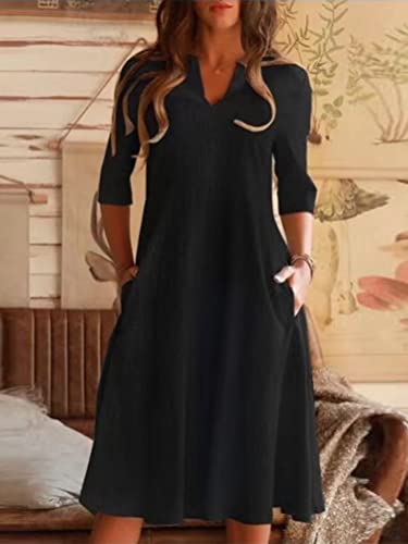 ORANDESIGNE Abito Camicetta in Lino di Cotone Donna Lunghi Manica Eleganti Vestiti con Scollo a V Tinta Unita Casual Abito Longuette al Ginocchio Vestiti con Tasche E Nero XL