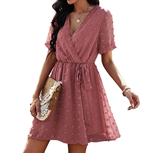 ORANDESIGNE Abito Estivo Donna Vestito Spiaggia Abiti Casual Corto Prendisole con Scollo a V Vestito Mini Casual Maniche Corta Elegante Vestito Cocktail Festa A Rosa L