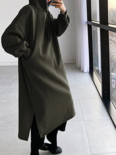 ORANDESIGNE Abito Felpato Donna Vestito Invernale Elegante Lungo Felpa con Cappuccio Manica Lunga Tinta Unita Hoodie Oversize Maxi Abito Pullover a Army Green L