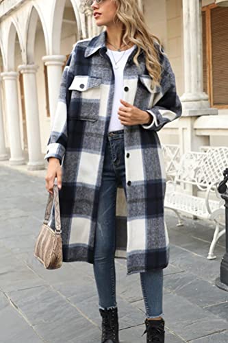 ORANDESIGNE Cappotti a Quadri da Donna a Lunga Manica Blusa Camicetta a Quadri Classica con Tasche Camicia Stile di Boyfriend Giacche C Blu Scuro L