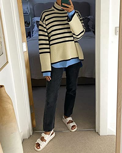 ORANDESIGNE Donna Maglione a Collo Alto a Righe Pullover a Maniche Lunghe Autunno Inverno Maglia Pullover Casual A Albicocca XS