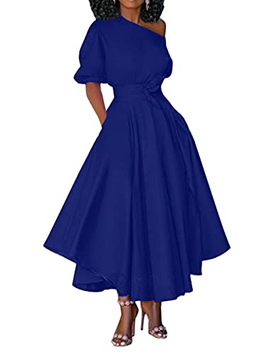 ORANDESIGNE Donna Vestiti a Pieghe Elegante Abito da Cerimonia Sera Vestito Maniche Corte Estivo Casual Tinta Unita Abito Monospalla Swing Vestito Abito Camicia a Vita Alta A Blu S