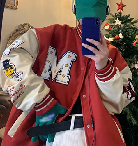ORANDESIGNE Giacca da Baseball Donna Oversize Giacche da Ricamo a Maniche Lunghe con Lettere Tasche Bottoni in Pelle Moda Felpa Motociclista Casual Vintage Autunno I Rosso XL