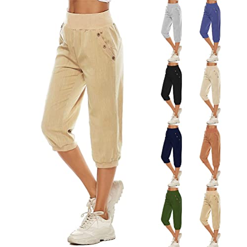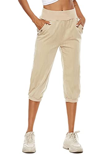 ORANDESIGNE Pantaloni Donna Estivi Leggeri con Tasche Pantaloni Sportivi Lino Pantaloni Cropped Leggeri con Tasche e Coulisse Pantaloni Palestra 3/4 Jogger Fitness A Cachi S