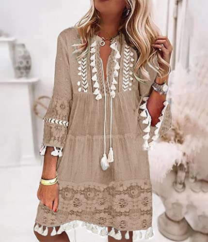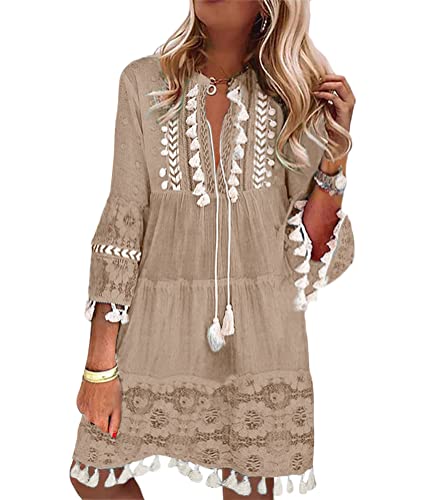 ORANDESIGNE Vestito da Donna a Maniche Lunghe con Scollo a V Mini Swing Abito Vestito a Tunica Vestito Estate Stile Scampanato Casual Nappa Abito A Cachi M