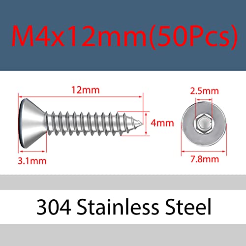 ORANXIN M4 x 12mm 50 Pcs Testa piatta Viti autofilettanti Acciaio inossidabile 304 Svasato Viti auto-perforazione Esagono interno Viti per legno