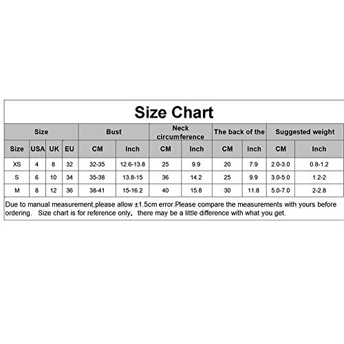 Taglia: XS: collo: 25 cm, busto: 32 cm - 35 cm, lunghezza schiena: 20 cm (circa). S: collo: 36 cm, busto: 35 cm - 38 cm, lunghezza schiena: 25 cm (circa). M: collo: 40 cm, busto: 38 cm - 41 cm, lunghezza schiena: 30 cm (circa)