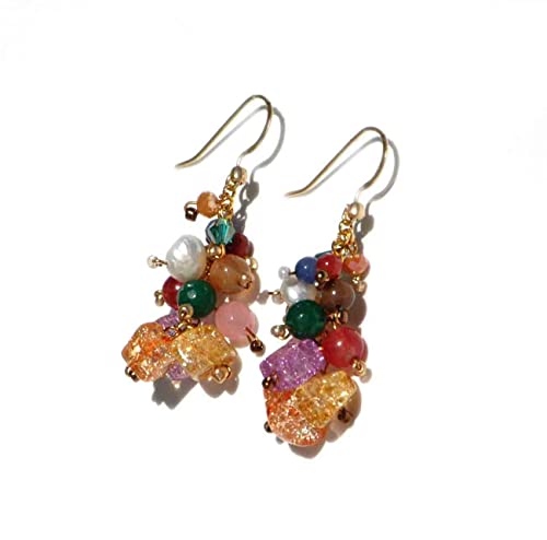 Orecchini artigianali pendenti. Grappolo di pietre dure, perle di fiume e ganci in argento. Regalo speciale donna