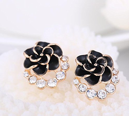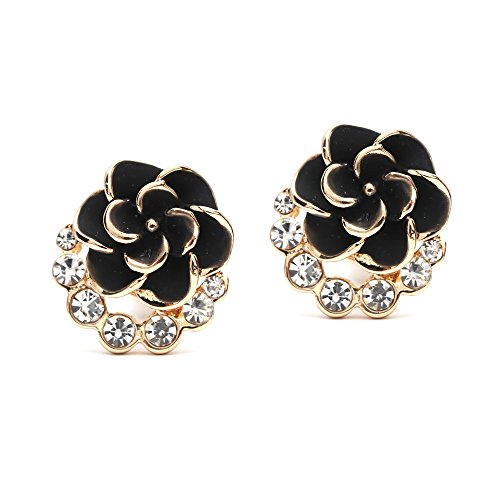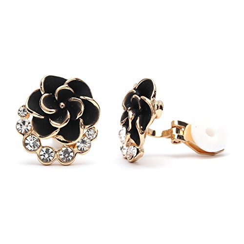 Orecchini a clip, con motivo floreale e cristalli, di colore nero