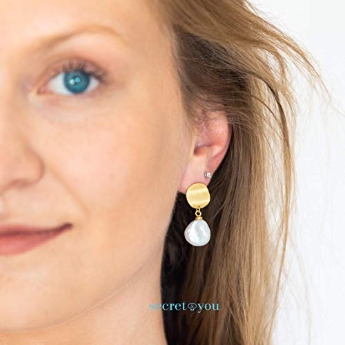 PERLE COLTIVATE D'ACQUA DOLCE: Orecchini di perle bianche piatte Keshi da donna di 12-13 mm Secret & You. Le perle Keshi sono perle barocche che la cozza d'acqua dolce crea senza un nucleo. Queste sono perle uniche, ognuna è diversa. Tendono ad essere più piatte e la lucentezza tende ad essere più intensa delle altre perle, dato che sono tutte madreperla in quanto non hanno un nucleo. Questa è una grande opzione se state cercando qualcosa di speciale.