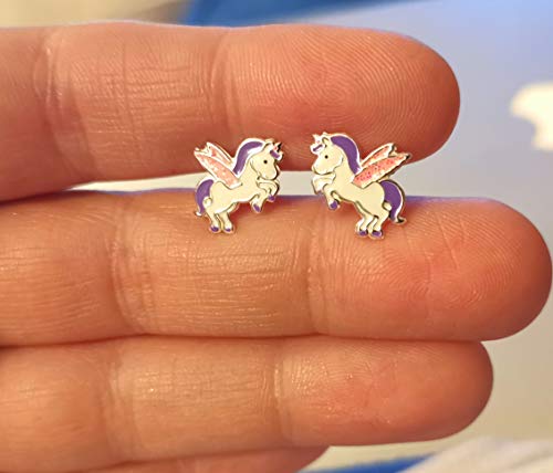 Orecchini a forma di unicorno volante, in argento Sterling, con glitter rosa