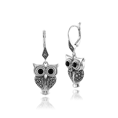 Orecchini a lobo a sospensione, argento massiccio 0,36ct marcasite, motivo: gufo, colore: nero onice