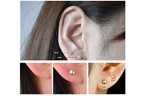 Dimensioni: spessore perno: 0,8 mm (calibro 20). Lunghezza perno: 10 mm. Diametro sfera: 2 mm/3 mm/4 mm. Adatto a quasi donne e ragazze. Adatta per cartilagine, lobi standard, lobo superiore, elica, orbitale
