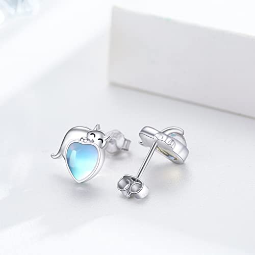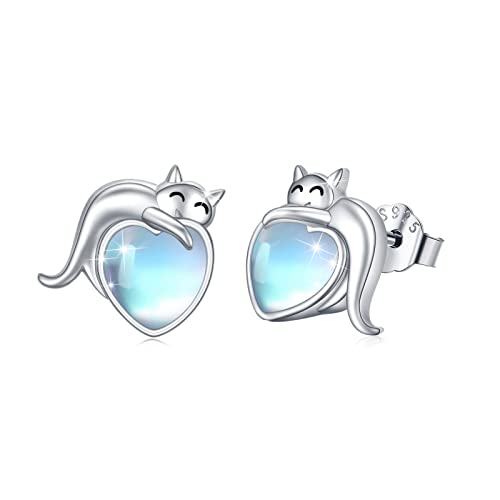 Orecchini a perno con gatto, orecchini a bottone in argento con pietra di luna cuore amore gatto carino, orecchini a bottone in argento sterling 925/pietra di luna con animali carini gioielli regali