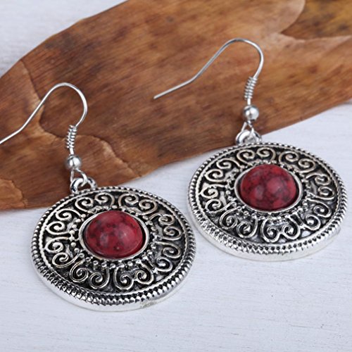 Orecchini vintage Yazilind a gancio, in argento tibetano, con ciondolo rosso rotondo in resina in rilievo