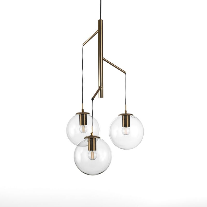 Lampadario FALL - realizzato in vetro / acciaio colore Oro opaco - dimensioni cm. H.77 Ø.38 - filo elettrico cm.90 regolabile - Nr.3 sfere in vetro trasparente Ø.13 cm - predisposta per nr.3 lampadine E27 max 40W (non in dotazione) - Voltage 220v 50Hz