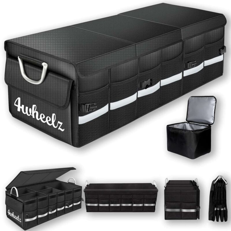 Organizer per auto Essen nero Utilizzo: organizer da viaggio | Colore: nero Essen è un capiente organizer per auto che aiuta a mantenere l'ordine nel bagagliaio. Si adatta alle tue esigenze, grazie al suo design ben studiato che ti permette di dividerlo in parti o ridurlo di 2/3. Realizzato con materiali di altissima qualità, come OXFORD 1680D, Essen è durevole e resistente ai danni. La borsa ha maniglie in alluminio, cuciture robuste e piedini antiscivolo sul fondo per evitare che scivoli nel bagagliaio. Le tasche interne ed esterne offrono spazio aggiuntivo e la borsa è dotata di catarifrangenti per aumentare la sicurezza. L'Essen occupa poco spazio quando è imballato ed è dotato di una borsa termica aggiuntiva da 25 litri. Questo è un organizer per auto spazioso e solido che rende più facile mantenere l'ordine in macchina. Caratteristiche del prodotto Materiale: OXFORD 1680D (poliestere), alluminio Numero di camere: 3 Possibilità di dividere le camere: sì Piedini antiscivolo nella