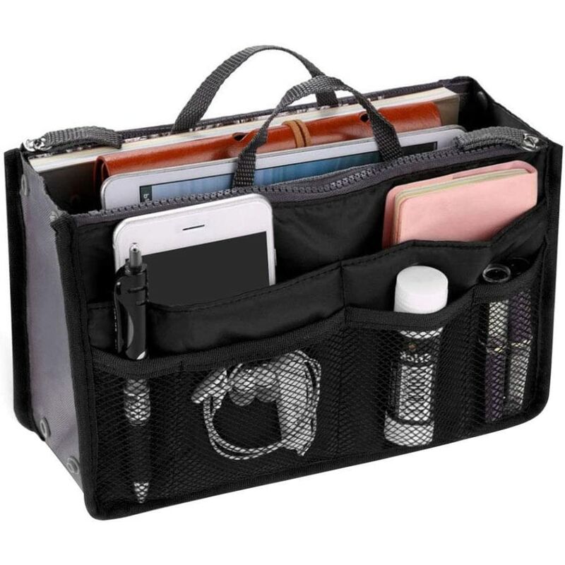 DETTAGLI TAGLIA - : organizer per borsa 28 x 17 x 4-10 cm (lunghezza x altezza x larghezza) con bottone a pressione, che può espandere la larghezza in pochi secondi [MATERIALE DI ALTA QUALITÀ ]: Realizzato in materiale di nylon resistente e impermeabile, facile da pulire con un asciugamano umido e pieghevole. Foderato per mantenere la forma della borsa portaoggetti [CON 13 TASCHE]: ci sono 13 tasche interne ed esterne, tra cui 1 borsa grande, 4 borse piccole, 2 tasche con cerniera e 6 tasche a rete< /p> [PER USO GIORNALIERO]: può contenere articoli da toeletta, articoli vari, chiavi, telefoni cellulari, mappe, libri, quaderni, articoli da viaggio, ecc. [AMPIO USO]: L'organizzatore della borsa è appositamente progettato per rendere più comodo lo stoccaggio. Adatto per viaggi, ufficio, viaggi di lavoro, casa, camera da letto, bagno Descrizione del prodotto Organizer per borsa da donna con 13 tasche Grande borsa espandibile con cerniera foderata e manico Ideale per documenti di viaggio