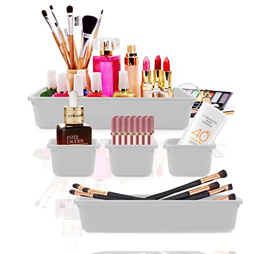 Organizer per Cassetti Cucina Bagno Divisori Cassetti 8pcs Organizzatore per Organizzazione Scrivania Contenitori per Trucchi in Plastica con 40 Cuscinetti in Silicone Antiscivolo (Grigio Chiaro)