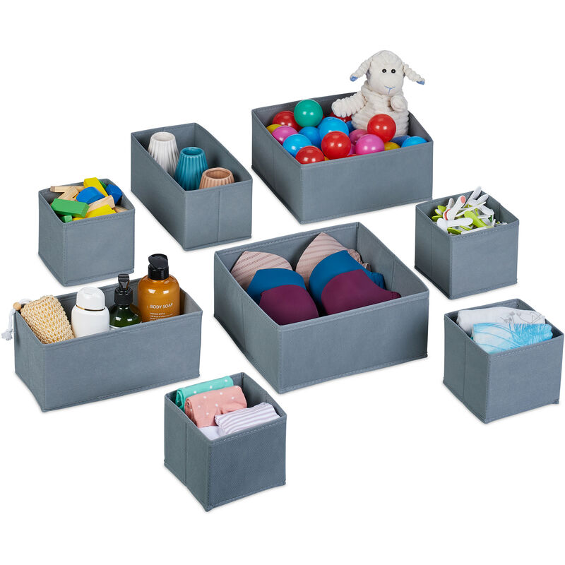 Con questo set da 8 organizer, potrai sempre tenere sotto controllo il contenuto dei cassetti e del comò. Inoltre, le scatole grigie sono anche elementi decorativi per gli scaffali. Il set è composto da 8 contenitori portaoggetti in 3 diverse dimensioni. Così potrai riporre vestiti, accessori o anche giocattoli e articoli da bagno. Quando non servono più, gli organizer per armadi possono essere semplicemente piegati e riposti per risparmiare spazio. Organizer in tessuto in dettaglio - Scatole piccole H x L x P: 13 x 14 x 14 cm ca. / 90 g ca. - Scatole medie H x L x P: 13 x 28 x 14,5 cm ca. / 140 g ca. - Scatole grandi H x L x P: 13 x 28,5 x 28,5 cm ca. / 220 g ca. - Capacità di carico: 2 kg ca. (ciascuno) - Materiale: plastica, cartone - Colore: grigio Set da 8 contenitori per armadi - Organizer per tenere in ordine cassetti, scaffali ecc. - Box perfetti per vestiti, accessori e giocattoli - Organizzatori da cassetto pieghevoli e salvaspazio - Scatole in 3 diverse dimensioni per un
