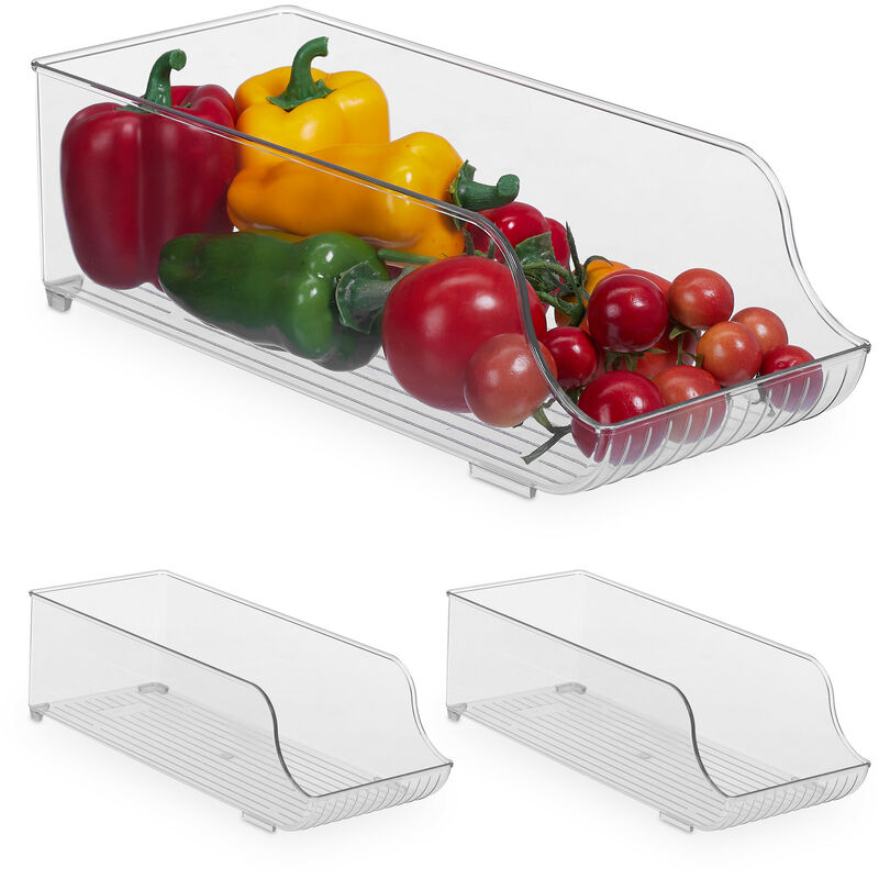 In un frigorifero disordinato è difficile tenere sott'occhio tutti gli alimenti e si finisce spesso per farli andare a male. Con l'organizzatore da cucina trasparente è possibile avere una visione d'insieme e creare ordine. Utilizza questo cassetto da frigo per conservare yogurt, salsicce, formaggi e molto altro. Nella credenza della cucina o nella dispensa, invece, puoi usare la vaschetta per riporre spezie o alimenti come pasta, riso o scatolame. L'apertura ricurva consente di accedere facilmente al cibo. Contenitore frigorifero in dettaglio - Dimensioni H x L x P: 10,5 x 14 x 35 cm ca. - Dimensioni interne H x L x P: 9,5 x 13,5 x 34,5 cm ca. - Peso: 380 g ca. - Materiale: plastica PET - Colore: trasparente - Set da 3 Organizzatore per il frigo della cucina - Per riordinare frutta e verdura fresca - Adatto per contenere i vasetti di yogurt, formaggi e salumi - Perfetto anche per sistemare pasta e conserve sugli scaffali - Design trasparente per avere maggiore visibilità - L'apertura