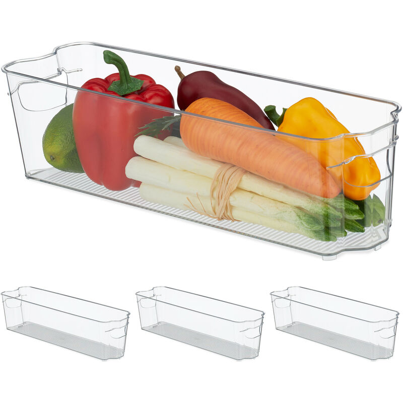 In un frigorifero disordinato è difficile tenere sott'occhio tutti gli alimenti e si finisce spesso per farli andare a male. Con l'organizzatore da cucina trasparente è possibile avere una visione d'insieme e creare ordine. Utilizza questo cassetto da frigo per conservare yogurt, frutta, formaggi e molto altro. I manici permettono di estrarre comodamente l'organizer dal frigo per avere sempre tutto a portata di mano. Può essere utilizzato anche in bagno per sistemare i detersivi o i prodotti di make up. Contenitore per frigorifero in dettaglio - Dimensioni totali H x L x P: 10 x 38 x 10,5 cm ca. - Misure interne H x L x P: 9,5 x 36 x 10 cm ca. - Peso: 270 g ca. - Materiale: plastica PET (senza BPA) - Colore: trasparente - Set da 4 contenitori Organizzatore salvaspazio e funzionale per la cucina - Per organizzare e conservare al meglio frutta, verdura, uova e salumi - Cestino da utilizzare anche nella credenza per riporre pasta, spezie ecc. - Con manici laterali per un facile utilizzo