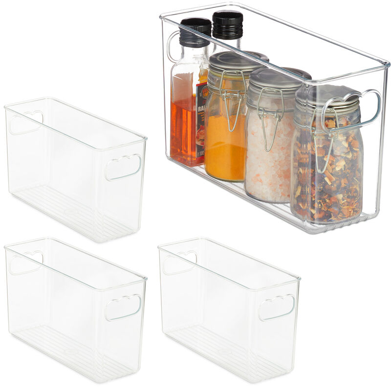 Una buona organizzazione nel frigorifero permette di avere una buona visibilità degli alimenti e di buttare via in tempo i cibi avariati. Con questo organizer frigorifero potrete portare ordine lì dove di solito regna il caos. Il contenitore sottile permette di riporre yogurt, formaggi, smoothie o altro nel frigo mentre sugli scaffali potete utilizzarlo per sistemare pasta, spezie o conserve. Grazie al design trasparente della scatola salvaspazio avrete sempre sotto controllo le vostre scorte di cibo. Organizer frigorifero in dettaglio - Dimensioni H x L x P: 15,5 x 10 x 26,5 cm ca. - Volume: 3,4 litri ca. - Peso: 300 g ca. - Materiale: plastica - Colore: trasparente- Set da 4 Organizer frigorifero sottile con manici - Sottile e ideale per conservare gli alimenti - Perfetto per sistemare pasta e conserve sugli scaffali - Design trasparente per avere maggiore visibilità - In alternativa può essere usato in bagno come porta trucchi - Con impugnature per estrarlo facilmente Contenuto
