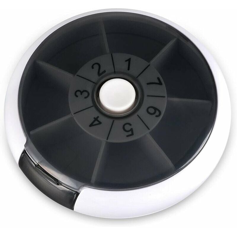 Materiale: 100% PP. Senza BPA. Ideale per viaggi e sport all'aria aperta. Piccolo e leggero: il diametro è di 9 cm. Il suo peso è di soli 50 g. Puoi metterlo in tasca o in borsa. Facile da riempire: apri il pannello superiore trasparente e accedi a 7 scomparti contemporaneamente. Puoi usarlo tutti i giorni per una settimana. Divertente da usare: premi il pulsante bianco e gli scomparti interni ruotano in senso orario. C'è un portello sul lato per accedere individualmente a ciascun segmento e versare le pillole.