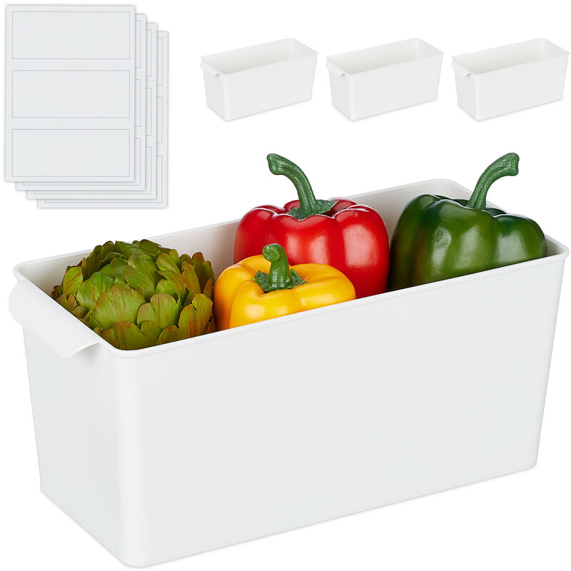 Sei alla ricerca di un modo pratico per tenere la casa in ordine, senza avere sempre quei piccoli oggetti sparsi in giro? Queste scatole organizer in set da 4 sono la soluzione ideale con cui potrai organizzare armadi e cassetti. Che si tratti di cosmetici, giocattoli o calzini, queste versatili box portaoggetti permettono di riporre tutto in modo ordinato. Non solo per cassetti e armadi, ma anche per la dispensa o addirittura il frigo! Le scatole, infatti, possono essere usate anche per conservare yogurt e altro nel frigorifero. Grazie alle etichette, il contenuto è immediatamente riconoscibile. Set da 4 scatole organizer portaoggetti in dettaglio - Dimensioni totali H x L x P: 12,5 x 12,5 x 28 cm ca. - Dimensioni interne H x L x P: 12 x 12 x 26 cm ca. - Dimensioni di ciascuna etichetta H x L: 2,5 x 5,5 cm ca. - Capacità di carico: 5 kg max. ca. - Peso per ogni scatola: 160 g ca. - Materiale: plastica - Colore: bianco Pratici cestini portaoggetti in plastica - Box per riporre in modo