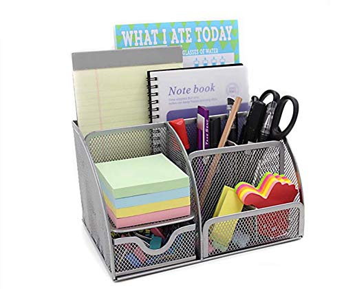 Organizer da scrivania in rete con 7 scomparti, organizer compatto da ufficio, multifunzione, salvaspazio, in metallo, portapenne, per ufficio e scuola (argento)