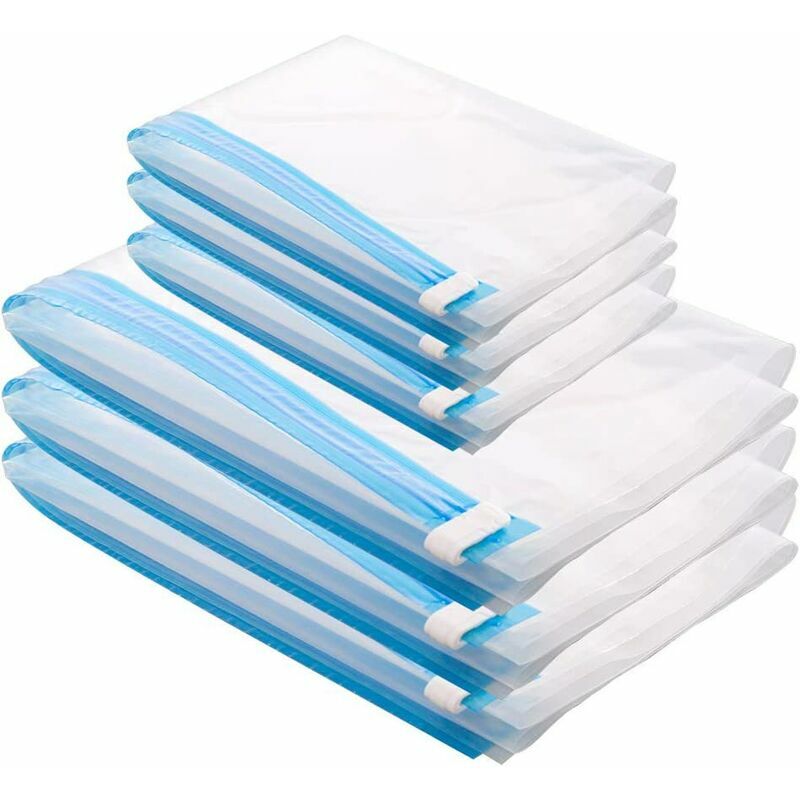 Contenuto - Confezione da 6 sacchetti sottovuoto: 3 grandi (70*50 cm) + 3 medi (60*40 cm). mano succhiata. Dopo la compressione, i sacchi possono essere arrotolati o impilati. Porta con te solo una valigia invece di tre! Nessun vuoto o pompa richiesta - La tecnologia di aspirazione della valvola consente una compressione ottimale senza hardware aggiuntivo. - C'è una sola via aerea sul fondo della borsa. Metti semplicemente i tuoi oggetti nella borsa, chiudi la cerniera e arrotola! Facile da riporre, utile per liberare spazio nei tuoi armadi. Risparmio di spazio: arrotolare ed espellere l'aria riduce le dimensioni dei tuoi effetti personali dell'80%, offrendoti più spazio nella valigia o nello zaino. Tieni separati i panni sporchi da quelli puliti quando sei in viaggio. Perfetto per i tuoi vestiti, asciugamani, coperte, cuscini, ecc. Protezione ideale: proteggi i tuoi vestiti da polvere, muffa, umidità, odori, insetti, farfalle, acqua o liquidi, ecc. Inoltre, le tasche possono essere