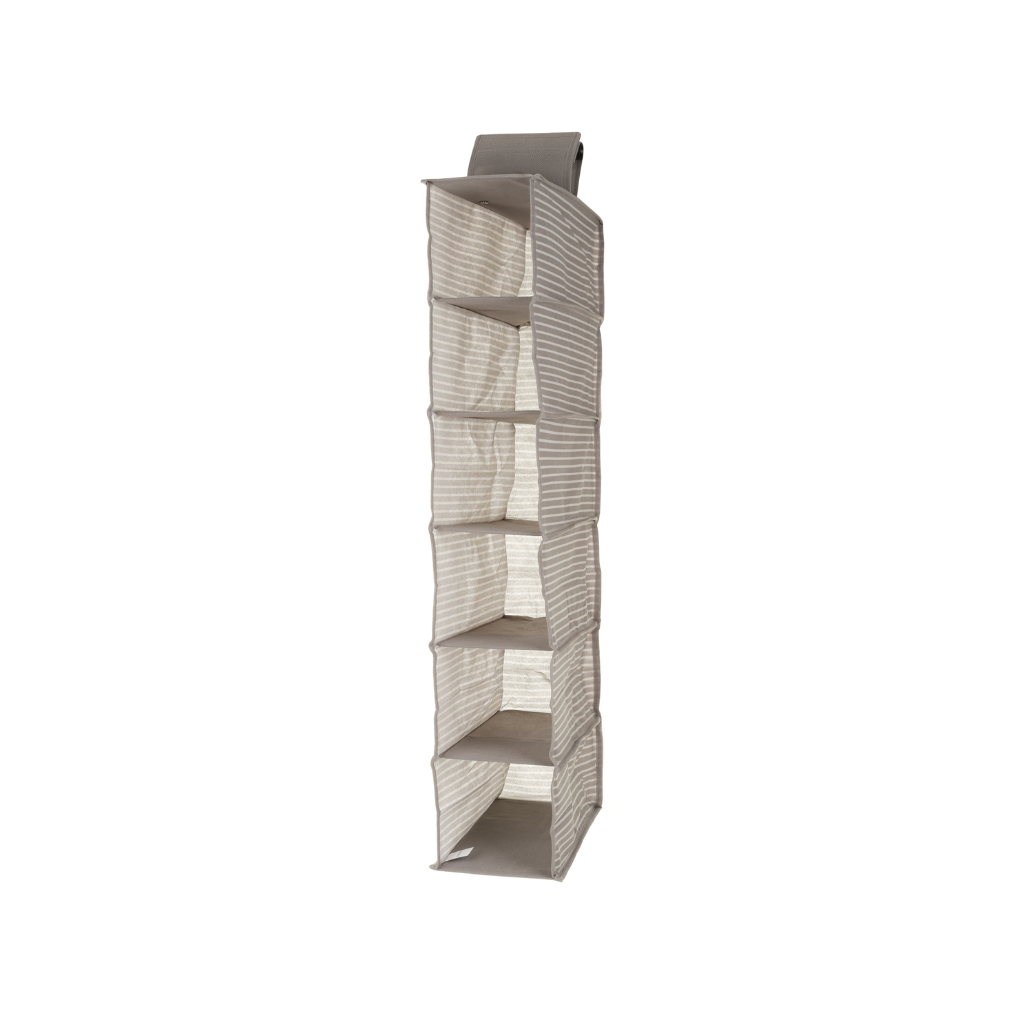 L'organizer verticale e salvaspazio della linea Sofia offre una soluzione funzionale per riporre in ordine scarpe, vestiti e accessori all'interno di armadi e guardaroba. Grazie alla pratica striscia di velcro presente sulla parte superiore, puoi appenderlo alla barra appendiabiti della tua cabina armadio. Nei 6 comodi scomparti c'è spazio per sciarpe, cappelli, borse, ma anche magliette e altri capi piegati da avere a portata di mano. Perfetto per organizzare al meglio la disposizione interna del tuo armadio, puoi portarlo con te anche in viaggio grazie alla struttura pieghevole che occupa pochissimo spazio in valigia. Design colore grigio con stampa rigata. Dimensioni: 15x30xh84 cm.