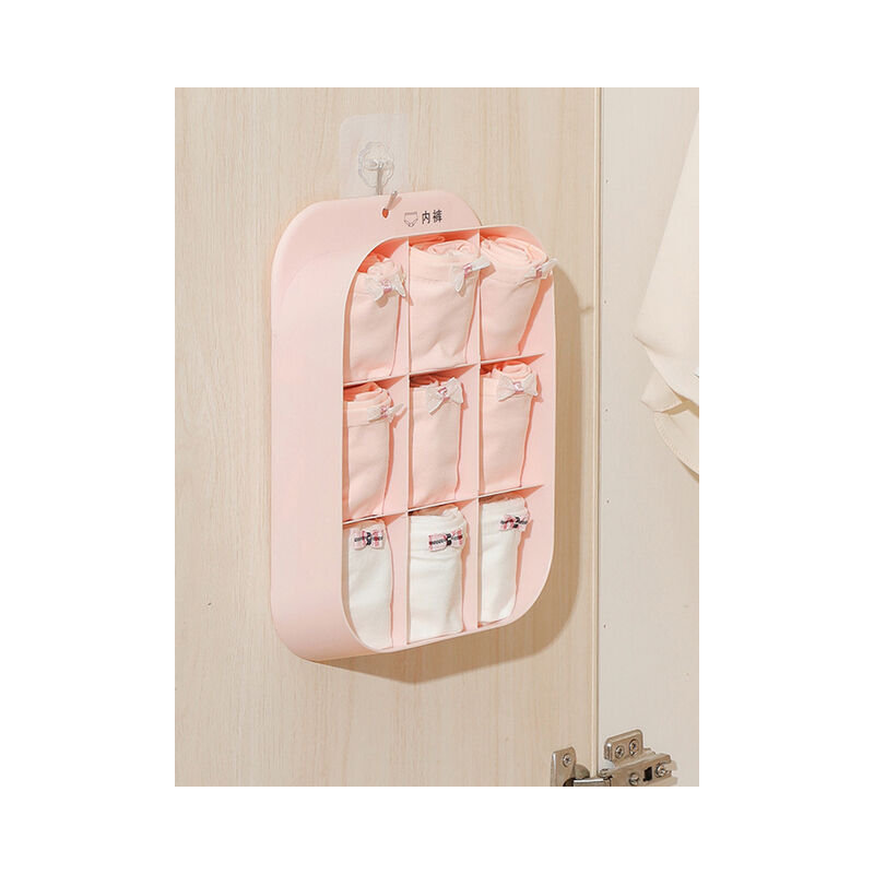 Wall-mounted storage box underwear and socks can be stored Develop new storage space to make full use of idle spaceSocks and underwear can be storedLarge lattice to meet various storage needs Complimentary stickers can be used as requiredSocks underwear socks The partition design avoids cross infectionThe grid design is convenient and hygienicThe corners are rounded, the PP material is preferred, and the surface is smooth and flawless Built-in tilt angleTilt design, not easy to fall when stored Installation steps1. Dry the surface and attach the hook to squeeze out the excess air2. Attach a patch to the back and remove the film3. Hang the product4. Press hard until the back completely fits the wall SCENE PRESENTATIOshoe cabinet cabinet door The cabinet sideProduct details * The error of pure manual measurement does not affect the useProduct Name: wall hanging stocking boxColor: Pink/whiteMaterial: PP Plastic organizer box,storage solutions,underwear organiser,Organizer socks,organizer