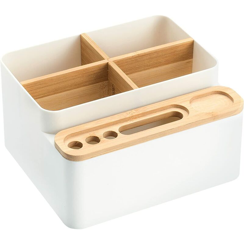 tienilo insieme in un posto conveniente! Dimensioni adatte: 18 × 16,2 × 10,2 cm / 7,16 x 6,37 x 4 pollici, perfetto per organizzare cellulare, telecomandi, pinzatrice, penne, matite, forbici, post-it, pennelli per il trucco, cosmetici e piccoli oggetti. /p> Elegante e design semplice: l'organizer per desktop è realizzato in resistente PS e materiale di bambù, ha una forma elegante con linee pulite, si abbina bene con l'altro arredamento della tua tavola. Ampia applicazione: tocco morbido, bordi arrotondati e finiture migliorare l'appeal visivo;