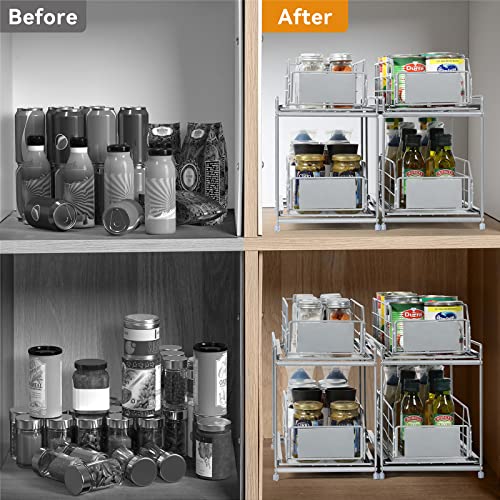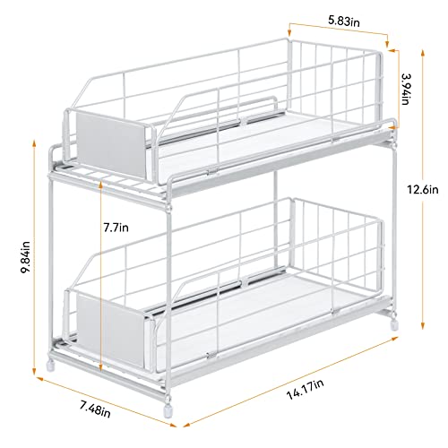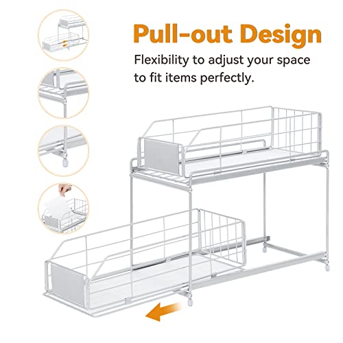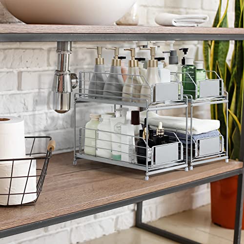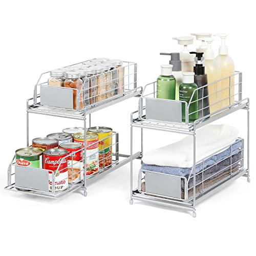 Set di 2 organizzatori sotto il lavandino, multiuso a 2 ripiani con cassetto scorrevole, per cucina, lavanderia, bagno, piano di lavoro, armadio in metallo (argento)