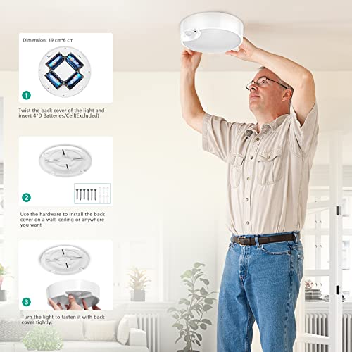【Luce del Sensore di Movimento a Batteria】- La plafoniera a LED è alimentata da 4 batterie alcaline D-cell (non incluse). È conveniente installare e sostituire con batterie nuove ruotando il coperchio posteriore della luce in senso antiorario.