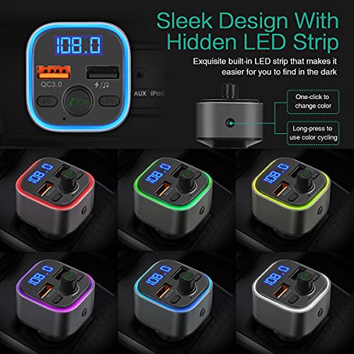ORIA Trasmettitore Bluetooth per Auto, Wireless Trasmettitore FM Radio Adattatori con Chiamate Vivavoce, Luce RGB a 6 Colori, QC 3.0 Caricabatterie USB, MP3 Audio Lettore Supporta U Disk & Carta TF