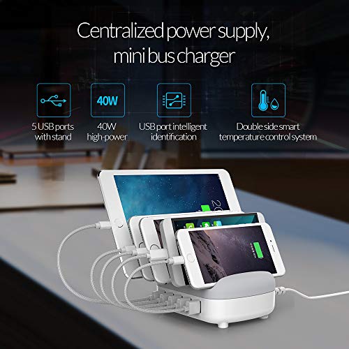 ORICO 40W con 5 Cavi Caricabatterie Smart USB con Supporto per Telefono Cellulare e Tablet per iPhone, iPad, Samsung Galaxy, Nexus, HTC, Motorola, LG e Altri,Bianca
