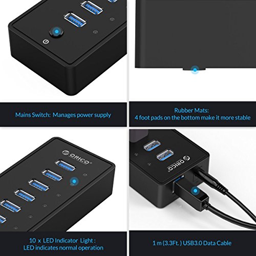 ORICO, hub con 7 porte USB 2.0 con adattatore di alimentazione per Regno Unito con 3 spinotti, porta di ricarica con interruttore on/off, colore nero - 10 Port USB 2.0