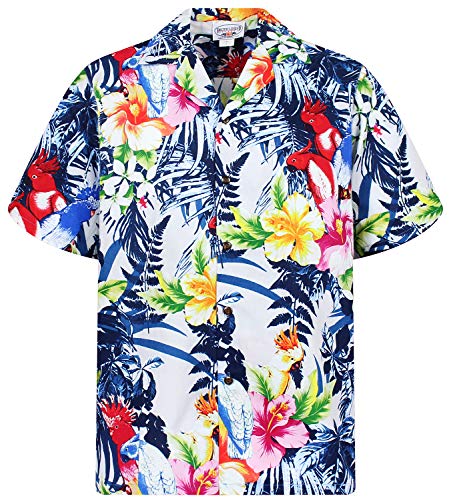P.L.A. | Original Camicia Hawaiana | Signori | S - 4XL | Maniche Corte | Tasca Frontale | Hawaii Stampa | Fiori | Bianco