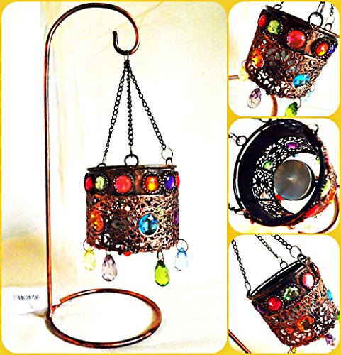 Original Moroccan Single Hanging Bejewelled Tealight Candle Holder With Bronze Metal Stand by SupremeBuy