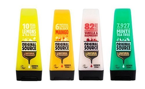 Original Source Docciaschiuma Set 4 x 250 ml Esotico Fragranze Mango, Limone & Tea Tree, Vaniglia & Fragola, Menta & tea tree