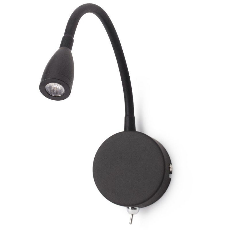Aplique de pared lector negro, modelo TOCOA. Tiene un brazo flexible que facilita su uso e incorpora el interruptor en la base. Incluye la fuente de luz integrada es HIGH POWER LED de 3W y una temperatura de color cálida de 3000K. Este aplique es ideal para iluminar espacios de lectura en salones y dormitorios.