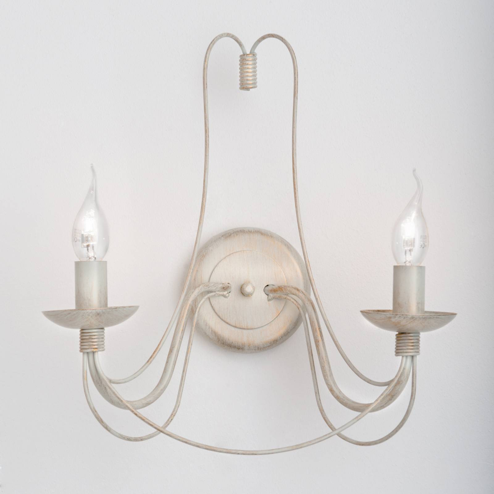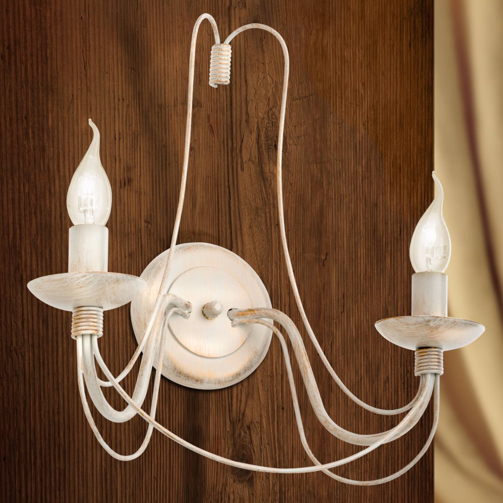 Lampada da parete Vela con due prese e finitura in oro avorioElegante ed elegante, la lampada da parete Vela in stile lampadario con il suo design sottile e curvo. La lampada è realizzata in acciaio e presenta una finitura in oro avorio, che le conferisce un aspetto antico. Le prese progettate come portacandele possono essere equipaggiate con lampade decorative a candela E14.