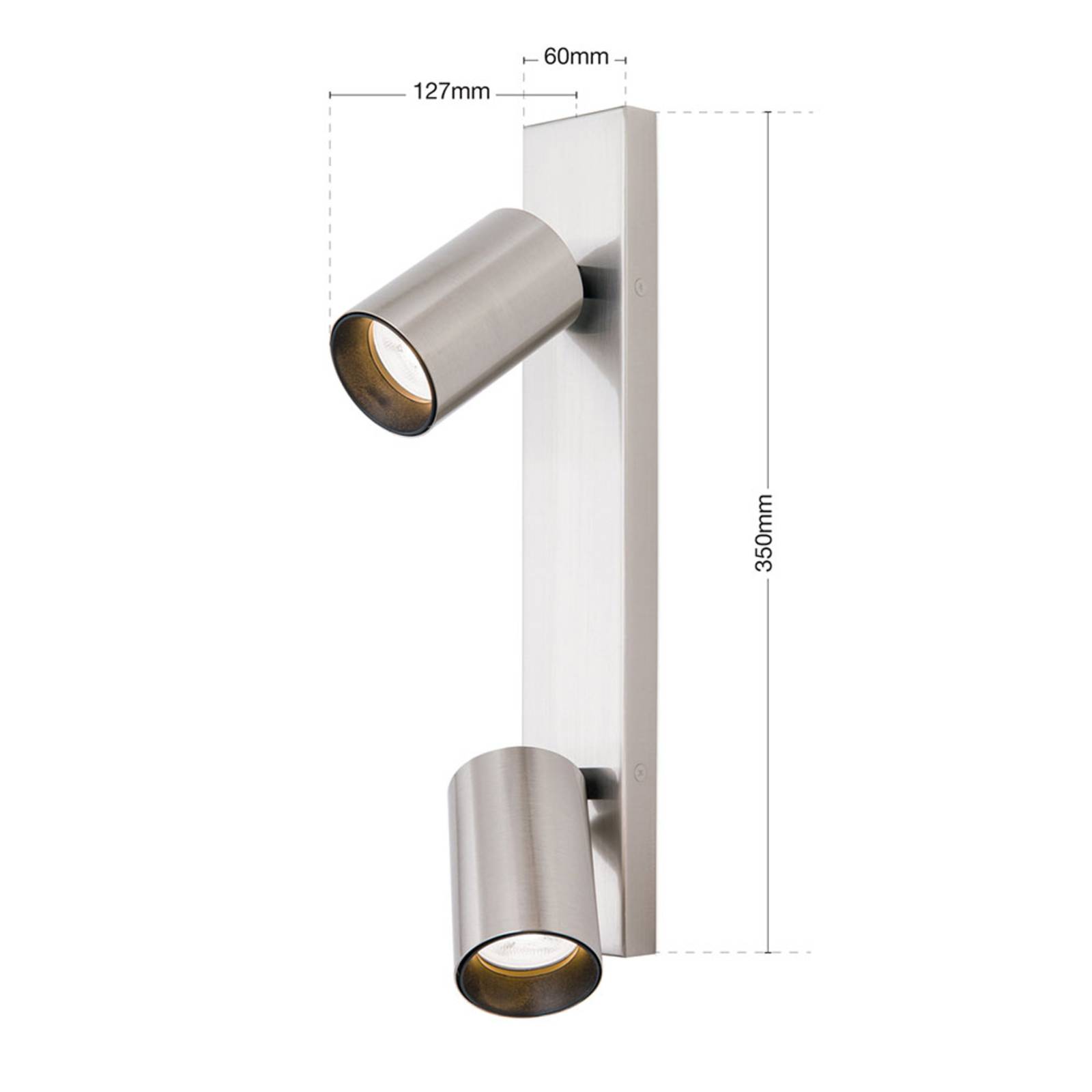 Faretto regolabile individualmente Sean - a due fiamme Per un'efficace illuminazione d'ambiente in soggiorni, camere da letto e corridoi, il faretto da parete Sean a due lampade con la sua moderna finitura in nichel opaco è adatto anche al montaggio a soffitto. Le teste dei faretti possono essere ruotate individualmente di 355° in modo che la direzione della luce possa essere variata a piacere. Gli angoli bui delle stanze appartengono quindi al passato. L'intensità della luce può anche essere regolata tramite un dimmer esterno. - Inserti riflettenti neri