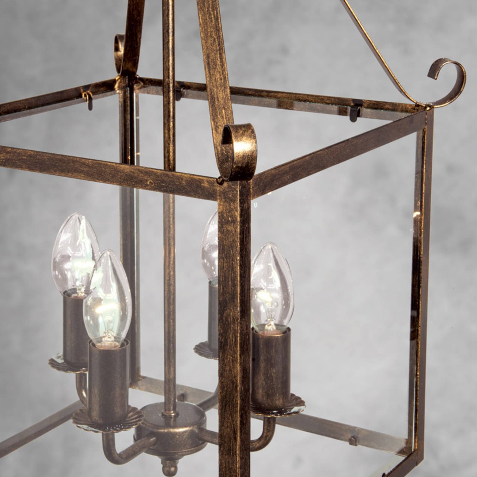 Lampada a sospensione Manto a forma di lanterna a quattro fiammeQuesta lampada a sospensione della serie Manto sa come convincere con un design rustico a lanterna. La struttura in acciaio decorata ad arte con finitura oro antico è completata da coperture in vetro trasparente sui lati. Quattro lampadine a forma di candela possono essere inserite nelle prese rivolte verso l'alto e non solo illuminano la stanza in questione, ma creano anche una scena perfetta per l'aspetto rustico.